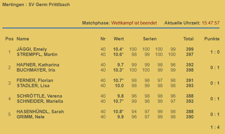 In der Spitzenpartie kam in Fenken für Prittlbach wieder Martin Strempfl zum Einsatz. Seine Gegnerin war die Weltklasseschützin Emely Jäggi aus der Schweiz. Emely begann fehlerfrei und Martin geriet mit einer 98 Serie gleich in Rückstand. Jäggi ließ sich diesen Vorsprung nicht mehr nehmen und gewann die Partie mit 399 zu 397. An Position 2 hingegen eröffnete Iris Buchmayer mit zwei blitzsauberen 100er Serien und ließ ihrer Kontrahentin mit 398 Ringen keine Chance. Somit stand es 1:1. Den zweiten Punkt für Prittlbach holte dann Nele Grimm. Nele und ihre Gegnerin hatten beide Startschwierigkeiten, aber dennoch lag Nele nach der Hälfte mit zwei Ringen vorne. Durch zwei gute Serien und 197 Ringen in der zweiten Hälfte ihres Programms gewann die Prittlbacherin mit 390 zu 388 Ringen. Während Mariella Schneider an Position 4 mit 393 zu 388 Ringen kein großes Problem hatte, musste Lisa Stadler hart kämpfen, um ihren zwei Ringe Vorsprung aus der ersten Serie ins Ziel zu bringen. Letztendlich gewannen die Prittlbacher das Match verdient mit 4:1