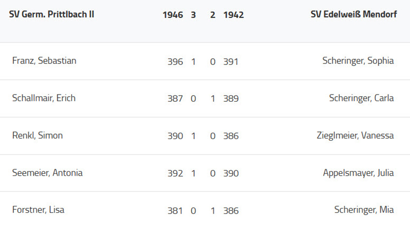 Für die 2. Mannschaft der Germania stand am Sonntag ein Wettkampf auf dem heimischen Schießstand in Prittlbach an. Gegner war die Mannschaft von Edelweiß Mendorf, die in der Tabelle zwei Punkte vor den Prittlbachern lagen. Beide Mannschaften mussten den Wettkampf gewinnen, um wichtige Punkte im Kampf gegen den Abstieg einzufahren. Nachdem zunächst die Partie 5 für die Germania verloren gegangen war, gelang es innerhalb von Sekunden Simon Renkl und Antonia Seemeier die Partien 3 und 4 zu gewinnen. Lange lag auch Erich Schallmair in Partie 2 gut im Rennen, musste aber das Match dann doch abgeben. So musste die Spitzenpartie entscheiden. Sophia Scheringer hatte 391 Ringe für die Mendorfer vorgelegt, doch Sebastian Franz behielt die Nerven, legte souveräne 396 Ringe hinterher und holte den Siegpunkt zum 3:2.