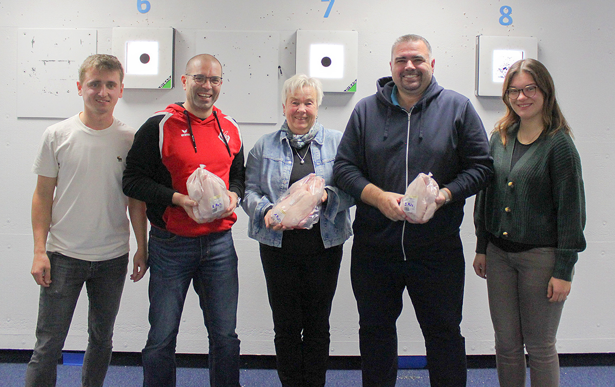 Auch in diesem Jahr richtete unsere 4. Luftgewehrmannschaft wieder das beliebte Kirchweihschießen aus. Insgesamt 40 Teilnehmerinnen und Teilnehmer, darunter 12 Jugendliche, versuchten ihr Glück auf der Glücksscheibe und kämpften um die meisten Punkte. Am treffsichersten zeigte sich Martina Scholz, die mit 60 Punkten den ersten Platz belegte und dafür vom Mannschaftskapitän der 4. Luftgewehrmannschaft, Andreas Brandmaier, eine Barbarie-Ente überreicht bekam. Florian Hillenbrand sicherte sich den zweiten Platz und durfte sich ebenfalls über eine Ente freuen. Der dritte Platz ging an Felix Schmitt, der als Preis ein Hähnchen erhielt. Im Anschluss wurde das erfolgreiche Kirchweihschießen in geselliger Runde noch ausgiebig gefeiert.