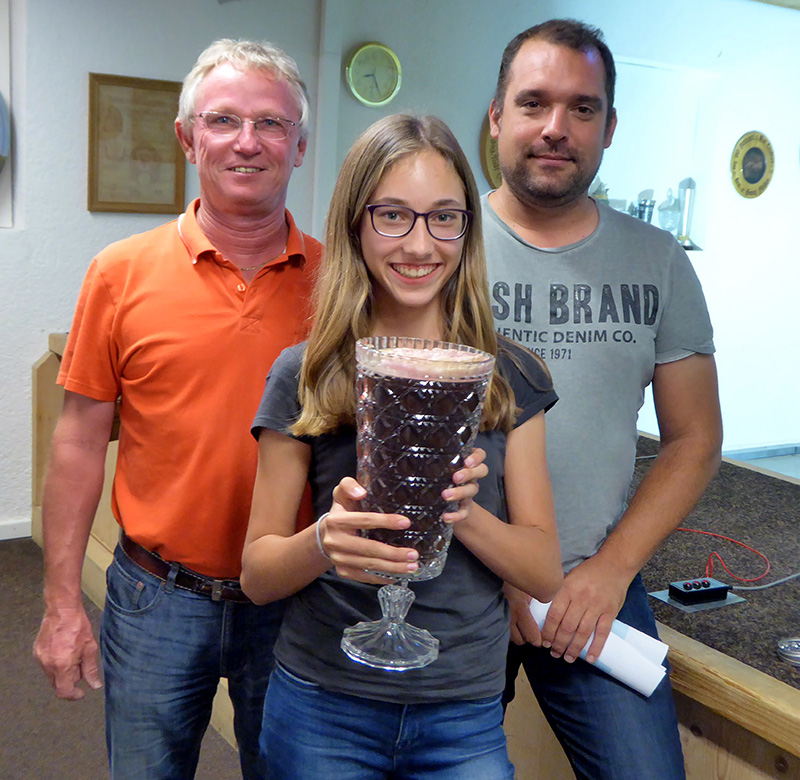 Traditionell wurde wieder der Kristallwanderpokal im K.O.-System ausgeschossen. Anna Brandmair hatte sich wie im Vorjahr sehr erfolgreich bis in Finale vorgekämpft, wobei sie sich im Viertelfinale gegen ihren älteren Bruder durchsetzen musste. Im Finale gegen Alex Gasteiger war nach einem 9:9 noch ein zweiter Schuss nötig. Schützenmeister Roland Scholz und der Mannschaftsführer der zweiten LP-Mannschaft Gasteiger Robert gratulierten der jungen Siegerin und überreichten ihr den gefüllten Kristallpokal.