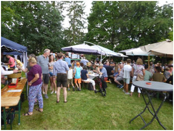 Für das leibliche Wohl sorgte in hervorragender Weise wieder Ingrid Schönwetter mit ihren Helfern(innen) an Salatausgabe und am Grill. Natürlich gab es auch wieder Wallners Puten-Gyros, eine Spezialität am Dorffest.