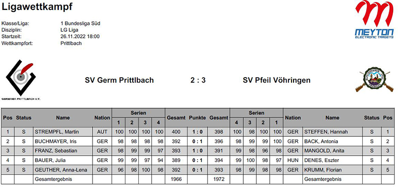 In der Vorsaison hatten nur die Germanen die Mannschaft vom SV "Pfeil" Vöhringen bezwingen können. Doch diesmal verlief der Wettkampfverlauf ganz anders. Iris Buchmayer und Anna-Lena Geuther lagen nach der ersten Zehnerserie schon mit jeweils zwei Ringen in Rückstand. Geuther verkürzte in der dritten Serie mit 100:99 gegen Florian Krumm noch um einen Zähler, zu mehr reichte es nicht und so ging der Punkt mit 392:393 an Krumm. Buchmayers Abstand zu Antonia Back betrug am Ende sogar vier Punkte. Schnell stand es 0:2 gegen die Hausherren.