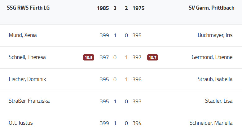 Etienne Germond, unsere Nummer 2, hatte mit der Junioreneuropameisterin Theresa Schnell eine erbitterte Gegnerin. Zu keiner Phase konnte sich einer der beiden Kontrahenten vom anderen absetzen und so endete diese Partie mit 397 zu 397. Über den Gewinner dieses Duells musste also im Stechen entschieden werden. Nun kam es auf das Match 4 an, in dem sich Franziska Strasser und für Prittlbach Lisa Stadler gegenüber standen. Nach 30 Schuss stand es hier 296 zu 296. Leider unterliefen Lisa in der letzten Serie einige Fehler, so dass diese Partie letztlich den dritten Punkt für die Fürther brachte. Um den letzten zu vergebenen Einzelpunkt entbrannte dann ein hochklassiges Stechen. Dreimal legte Theresa Schnell eine 10 vor, die Etienne jedes Mal nervenstark egalisierte. So musste der vierte Stechschuss entscheiden, der auf Zehntelringe ausgetragen wird. Wiederum schoss Theresa zuerst und erzielte eine 10,5, die Etienne mit einer souveränen 10,7 konterte und somit den zweiten Einzelpunkt für die Germania holte. Alles in allem eine gute Leistung der Prittlbacher, die aber nicht den verdienten Lohn einbrachte.