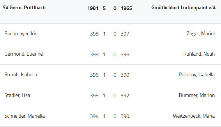 Am Sonntag ging es gegen den Tabellenvorletzten aus Luckenpaint. Die Prittlbacher gingen von Anfang an entschlossen zu Werke. In der Partie drei und fünf ließen Isabella Straub (396 zu 390) und Mariella Schneider (394 zu 390) von Anfang an keinen Zweifel daran aufkommen, wer hier Herrin im Haus war und holten diese beiden Punkte für die Germania. In der Partie 4 begann Marion Dummer gegen Lisa Stadler zwar stark, musste sich letztendlich aber der größeren Konstanz von Lisa geschlagen geben. Lisa holte sich diese Partie mit 395 zu 392 und sicherte den dritten Punkt und damit den Prittlbacher Gesamtsieg.