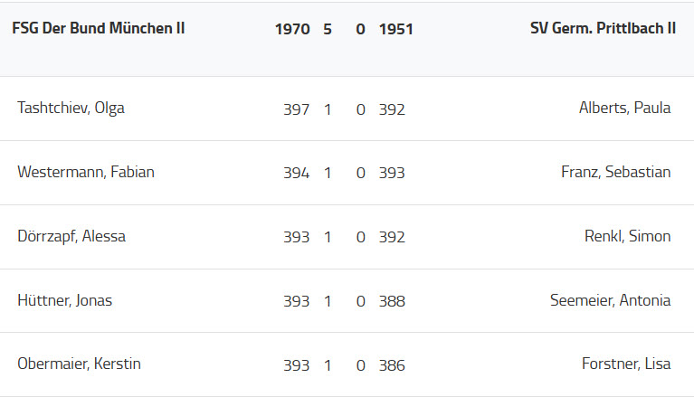 Gegen den Tabellendritten aus Fürth entwickelte sich von Beginn an ein Duell auf hohem Niveau. Das Prittlbacher Team versuchte alles, um sich die Chance auf die Finalteilnahme zu erhalten. Leider musste man relativ früh zur Kenntnis nehmen, dass auf den Positionen 1+5 an diesem Tag nichts zu holen war. In der Spitzenpartie erzielte Xenia Mund für Fürth 399 Ringe (nur der letzte Schuss verfehlte das Ziel) und auch ihrer Nummer 5 Justus Ott unterlief nur eine „9“. Somit gingen diese beiden Punkte an die Fürther. In den anderen drei Partien lief es besser für die Germania. Isabella Straub konnte die Partie 3 nach hartem Kampf mit einem 10er beenden und gewann ihren Wettkampf mit 396 zu 395 Ringen.