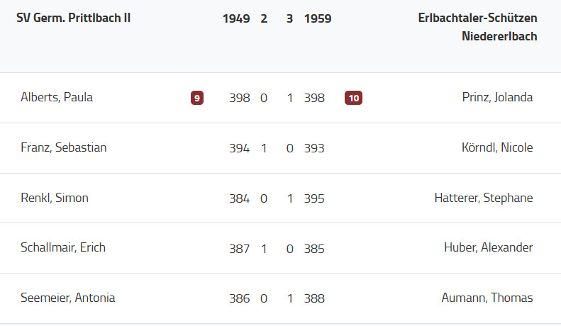Am Nachmittag hieß der Gegner dann Niedererlbach, auch eine Mannschaft aus der oberen Tabellenhälfte. Sebastian Franz und Erich Schallmair holten die beiden Punkte in der Partien 2 und 4, während die Duelle an 3 und 5 verloren gingen. An der Position 1 zeigte Paula Alberts ihre beste Saisonleistung und zwang Jolanda Prinz, die vielleicht beste Schützin der 2. Liga, mit 398 Ringen in ein Stechen. Leider war der Germania das Glück im Stechen nicht hold. Mit einer 9,9 verfehlte Paula die „10“ nur ganz knapp, während Jolanda eine 10,1 gelang und der Wettkampf letztendlich für die Prittlbacher 2:3 verloren ging.