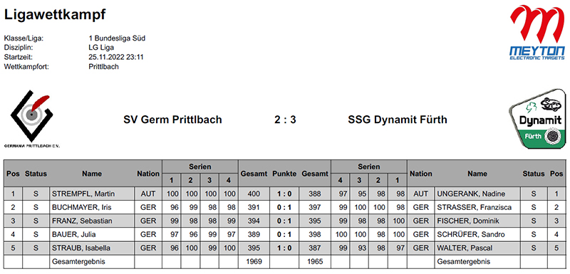 Auch Iris Buchmayer war mit 96 Ringen gestartet. Und obwohl auch sie sich steigerte war die Fürtherin Franzisca Strasser mit 391:397 am Ende die Bessere. Den entscheidenden Punkt für die Mittelfranken holte sich Dominik Fischer schon in der ersten Serie. 100:99 hieß es da gegen Sebastian Franz, der an seinem Geburtstag dann immer im Gleichtakt mit Fischer schoss. So endete dieses Duell 394:395 für die Dynamit Fürth.