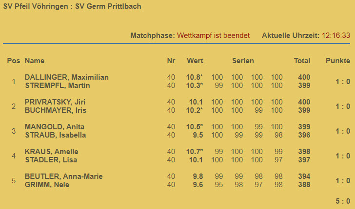 Es entwickelte sich von Anfang an ein spannender Wettkampf auf höchstem Niveau. Unser Neuling Mariella Schneider, die am ersten Wochenende gleich zwei Partien gewonnen hatte, schoss zwar wiederum stark, traf aber auf eine Sarah Morgott (Saltendorf), die an Position 5 an diesem Tag mit 397 Ringen einen optimalen Tag erwischt hatte. Mariellas 394 Ringe reichten damit diesmal nicht für einen Punkt. Besser erging es Isabella Straub an Position 3. Sie gewann mit 396 Ringen und an Position 4 sicherte Lisa Stadler mit ihrer Ligabestleistung (397) ihren Einzelpunkt und somit ging Prittlbach mit 2:1 in Führung. Unsere Nummer 2 Iris Buchmayer musste mit 396 Ringen gegen ihre Gegnerin ins Stechen. Das Spitzenduell zwischen der amerikanischen Weltklasseschützin Mary Tucker und Martin Strempfl war an Klasse und Spannung kaum zu überbieten. An Ende hatten beide nur je einmal die „10“ verfehlt und es stand 399:399, so dass auch hier ein Stechen über den Einzelpunkt entscheiden musste. Zunächst ging das Stechen an Position 2 für die Prittlbacher im zweiten Stechschuss verloren und so musste das Stechen in der „Einserpartie“ über den dritten Punkt und den Gesamtsieg entscheiden. Viele im Publikum waren der Meinung, dass bei der Klasse der beiden Schützen die Entscheidung wahrscheinlich erst im vierten Stechschuss, der auf 1/10 Ringe gewertet wird, fallen wird. Doch es kam anders. Gleich im ersten Schuss verfehlte die Amerikanerin im Dienst von Saltendorf die „10“ und Martin nutzte seine Chance mit seiner ganzen Routine und setzte seinen Schuss mitten ins Zentrum. Das Prittlbacher Team durfte damit über einen 3:2 Sieg jubeln.