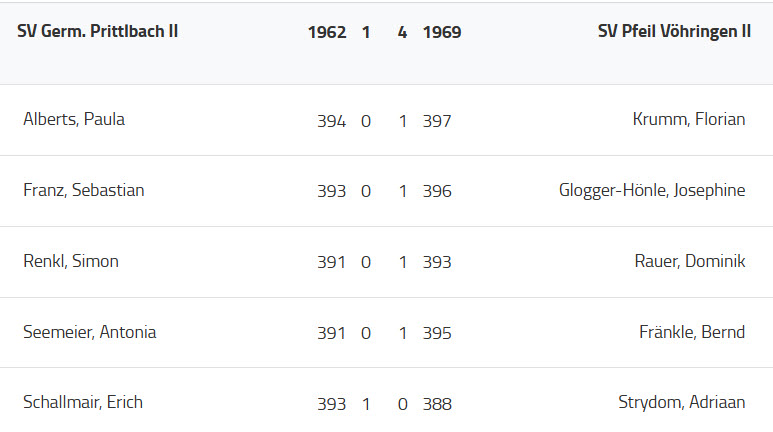 Für die 2. Mannschaft der Germania gab es am Sonntag leider nichts zu gewinnen. Es setzte zwei 1:4 Niederlagen gegen Unterstall und die 2.Mannschaft von Pfeil Vöhringen. Die erzielten Ergebnisse geben aber Anlass zur Zuversicht. So erzielte Paula Alberts 395 und 394 Ringe, aber auch die anderen Teammitglieder blieben zumindest einmal über der 390er Marke. Sebastian Franz mit 393 Ringen, Simon Renkl und Antonia Seemeier mit 391 Ringen. Unser Altmeister und Prittlbacher Urgestein Erich Schallmair zeigte mit 393 Ringen im zweiten Durchgang, dass er noch nichts verlernt hat.